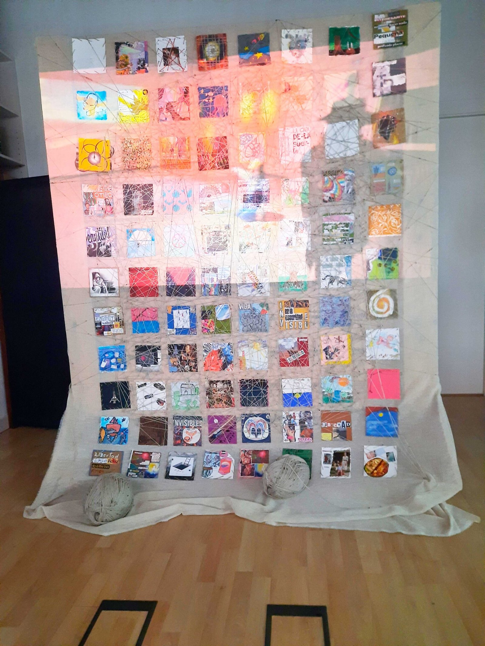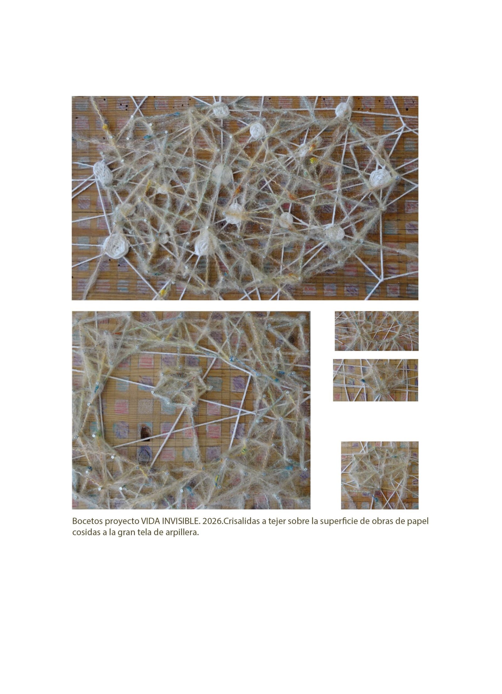 2026. Proyecto de trabajo colaborativo. Papel (fragmentos de 15×15 cm) cosido a tela de arpillera. Crisálida tejida en lana. El público puede intervenir en el tejido de dicha crisálida. Medidas variables.
